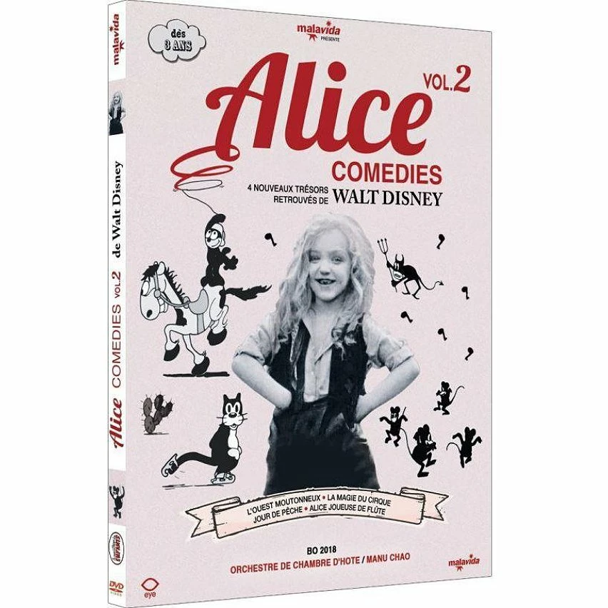 Le 2ème volume des aventures d’Alice rassemble 4 nouveaux épisodes de cette série parmi les premiers films de Walt Disney, créés entre 1924 et 1926. Mélanges virtuoses de diverses techniques d’animation, bijoux d’inventivité et de drôlerie, les films sont menés tambour battant par Alice, une héroïne féministe en chair et en os interprétée avec brio par trois jeunes filles : Virginia Davis, Margie Gay et Lois Hardwick. Sonorisés par l’Orchestre de Chambre d’Hôte et Manu Chao, ces quatre nouveaux burlesques noir et blanc ont été sélectionnés et restaurés par Malavida et la Cinémathèque des Pays-Bas, qui a retrouvé des copies d’origine.