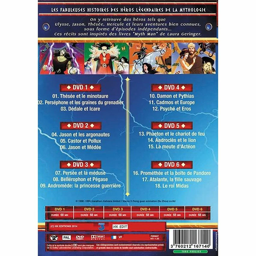 Les plus grandes légendes mythologiques en série animée. Aventures, héros et légendes sont au rendez-vous? Mythologie V1 : thesse et le minotaure – persephone et les graines du grenadier – dedale et icare – Mythologie V2 : jason et les argonautes – castor et pollus – jason et medee. Mythologie V3 : persee et meduse – bellerophon et pegase – andromede, la princesse duerriere. Mythologie V4 : damon et pythias – cadmos et europe – psyche et eros. – Mythologie V5 : phaeton et le chariot de feu – androcles et le lion – la meute d’acteon – Mythologie V6 : promethee et la boite de pandore – atalante, la fille sauvage – le roi midas.